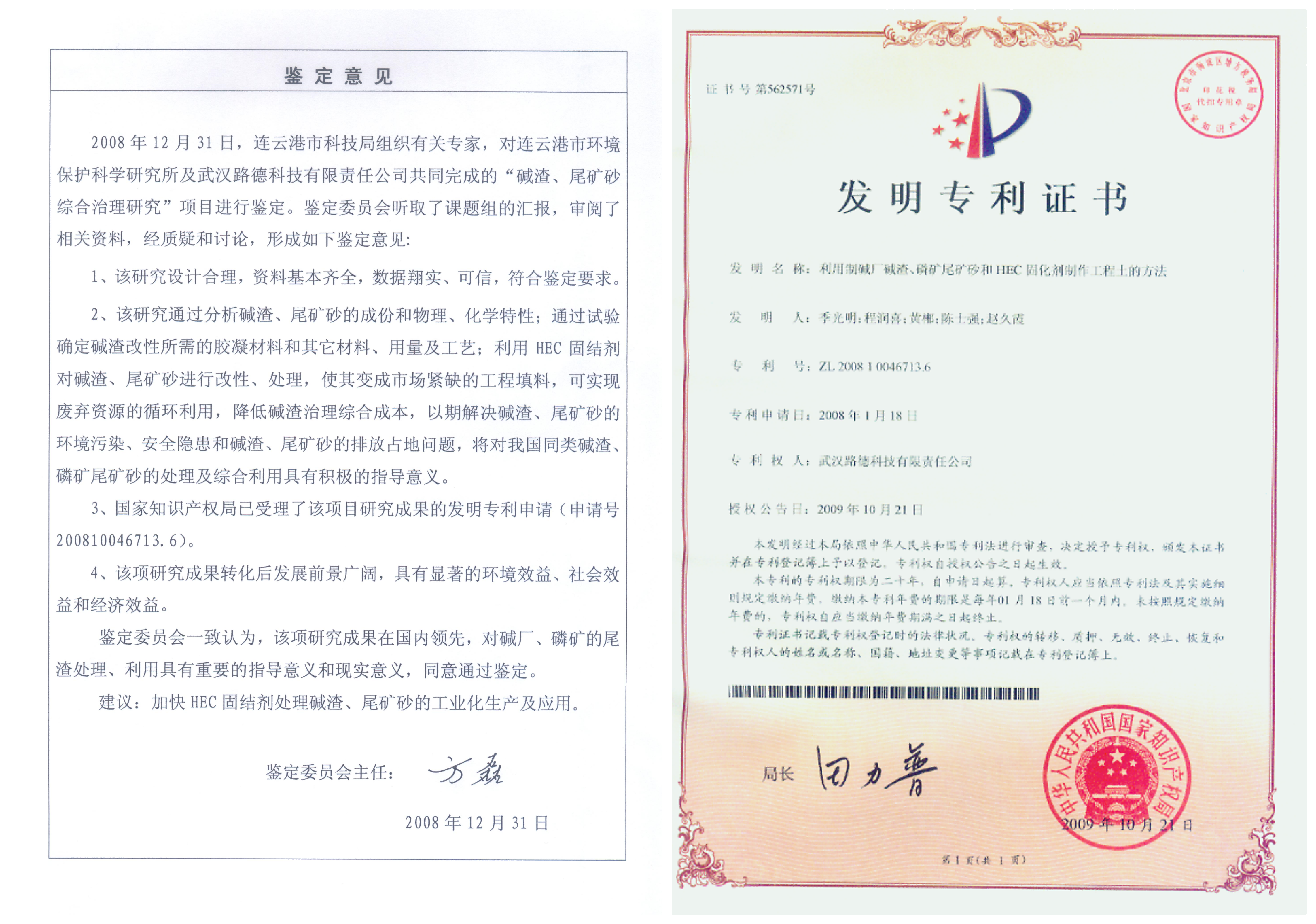 2009年10月21日,該技術(shù)又摘得一項(xiàng)桂冠:國(guó)家知識(shí)產(chǎn)權(quán)局授予的國(guó)家發(fā)明專利證書(“利用制堿廠堿渣、磷礦尾礦砂和HEC固化劑制作工程土的方法”、發(fā)明專利號(hào)ZL200810046713.6)。