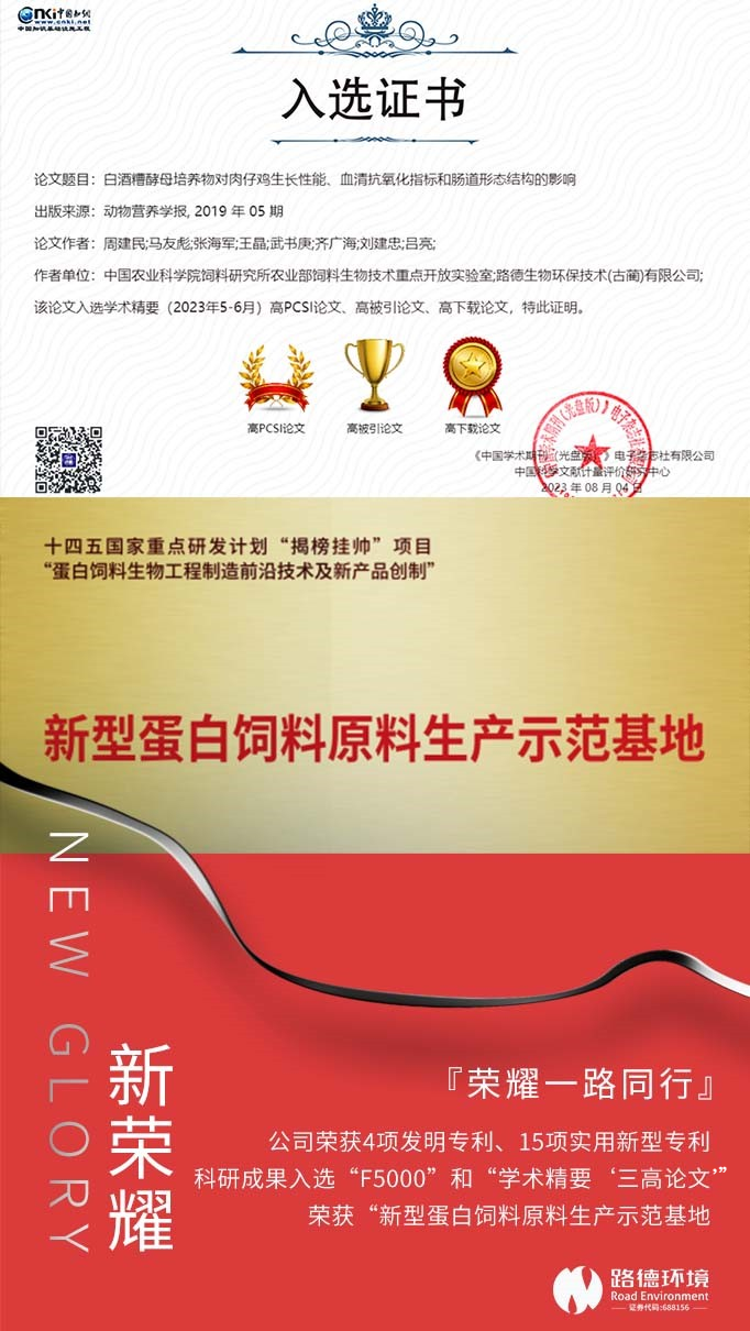 公司榮獲19項技術(shù)專利(4項發(fā)明專利、15項實(shí)用新型專利);合成生物科研項目入選湖北省科技廳2023年省科技計劃立項項目;產(chǎn)品應(yīng)用科研成果入選“F5000”和“學(xué)術(shù)精要‘三高論文’”;公司榮獲“新型蛋白飼料原料生產(chǎn)示范基地”稱號;河湖淤泥處理項目獲評“2023年度武漢環(huán)保產(chǎn)業(yè)優(yōu)秀環(huán)保項目案例”;獲評“中核集團(tuán)合格供應(yīng)商”。
