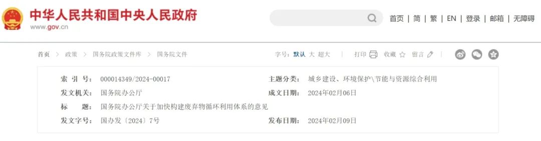 春節(jié)前夕,國務院辦公廳發(fā)布《關于加快構建廢棄物循環(huán)利用體系的意見(點擊閱讀政策原文)》(國辦發(fā)〔2024〕7號,以下簡稱《意見》)。