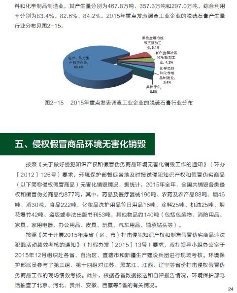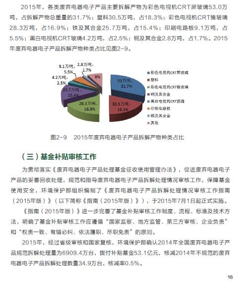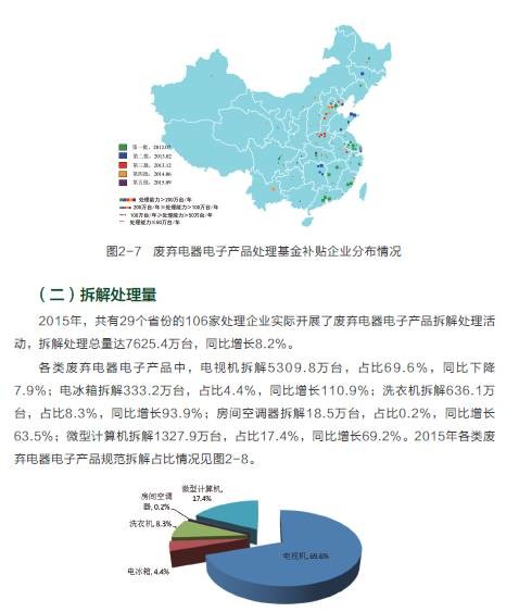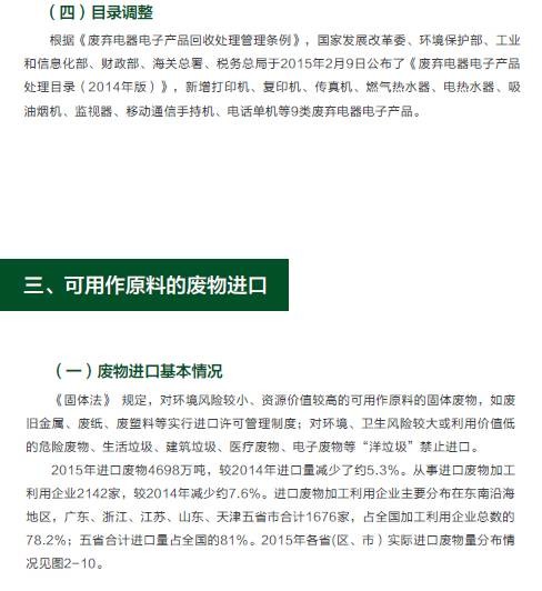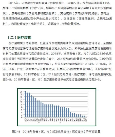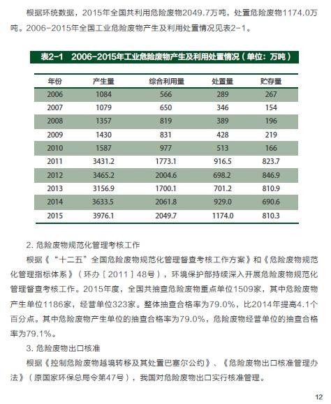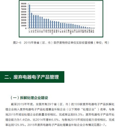 2015年,在危險(xiǎn)廢物污染防治工作方面,全國各省(區(qū)、市)頒發(fā)的危險(xiǎn)廢物經(jīng)營許可證共2034份,經(jīng)營單位核準(zhǔn)利用處置規(guī)模已達(dá)到5263萬噸/年,實(shí)際經(jīng)營規(guī)模為1536萬噸;持續(xù)深入開展危險(xiǎn)廢物規(guī)范化管理督查考核工作,各環(huán)境保護(hù)督查中心共抽查1509家企業(yè),整體抽查合格率為79.0%,比2014年提高4.1個(gè)百分點(diǎn)。在電子廢物污染防治方面,全國共有29個(gè)?。▍^(qū)、市)的109家廢棄電器電子產(chǎn)品拆解處理企業(yè)納入廢棄電器電子產(chǎn)品處理基金補(bǔ)貼企業(yè)名單,廢棄電器電子產(chǎn)品年處理總能力為1.4億臺,實(shí)際拆解處理總量達(dá)7625.4萬臺,同比增長8.2%。在可用作原料的廢物進(jìn)口方面,2015年進(jìn)口廢物4698萬噸,同比減少約5.3%;從事進(jìn)口廢物加工利用企業(yè)2142 家,同比減少約7.6%。
