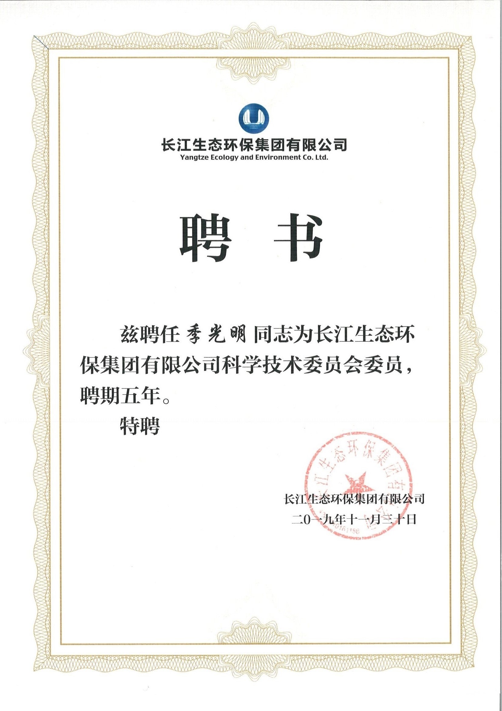 季光明董事長獲聘長江生態(tài)環(huán)保集團(tuán)有限公司科學(xué)技術(shù)委員會委員