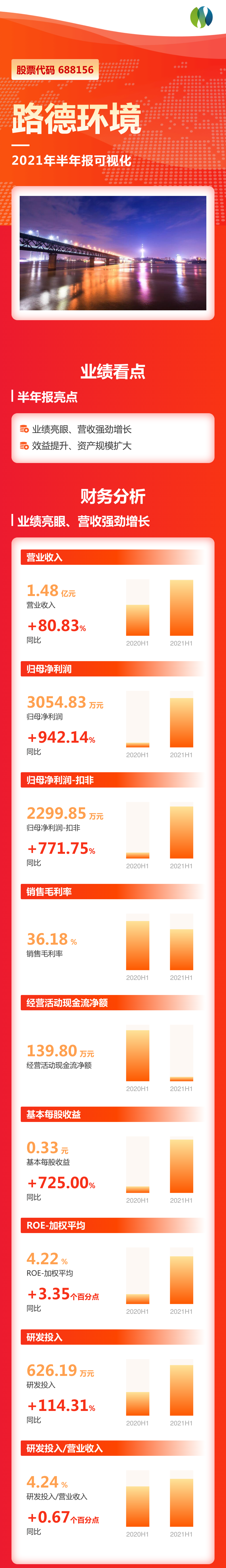 8月19日,路德環(huán)境發(fā)布2021年半年報(bào),上半年,公司實(shí)現(xiàn)營業(yè)收入14785.15萬元,同比增長80.83%;歸屬于上市公司股東的凈利潤3054.83萬元,同比增長942.14%。